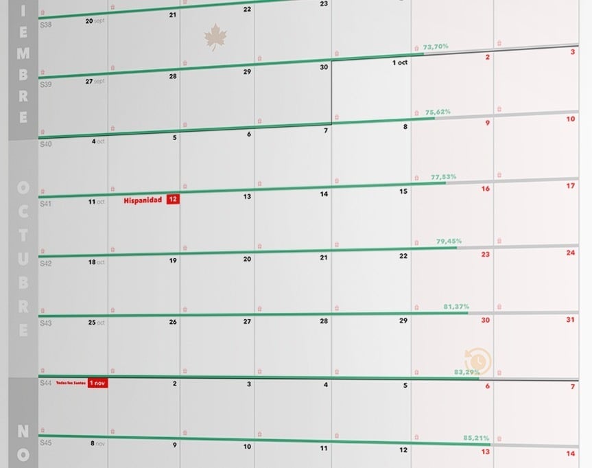 PDF a color con calendario anual que podrás imprimir en tamaño DIN A2 o DIN A1 para organizar tu año de una manera visual y sencilla.